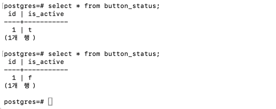 ✔️ 먼저 터미널에서 psql에 접속한 뒤, 버튼의 상태를 저장할 테이블을 만듭니다.