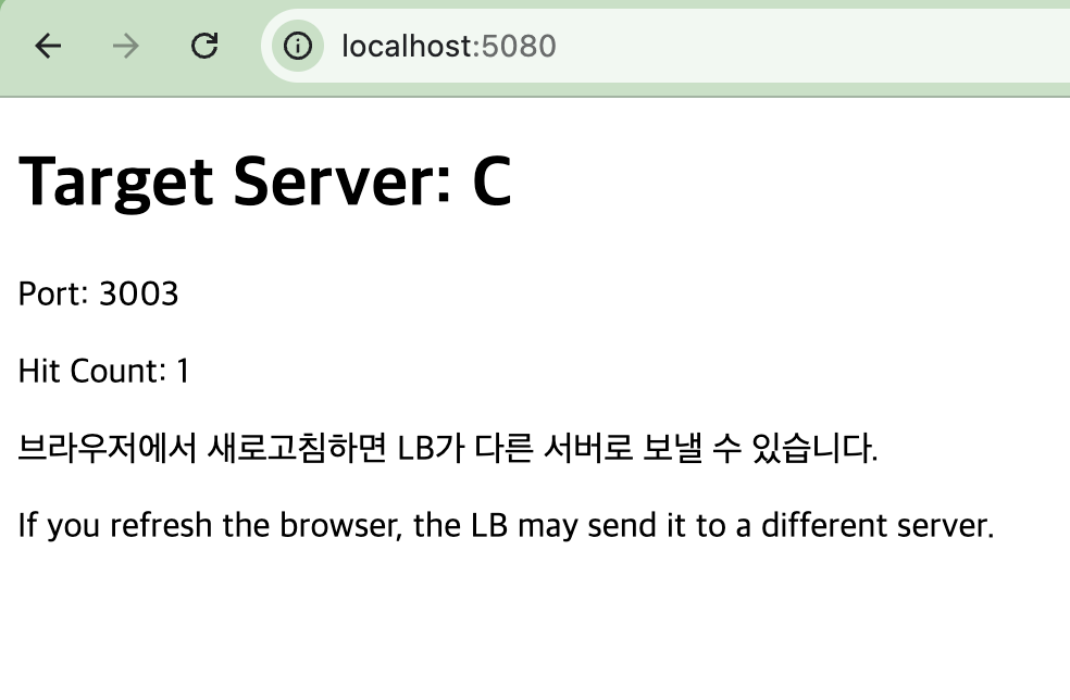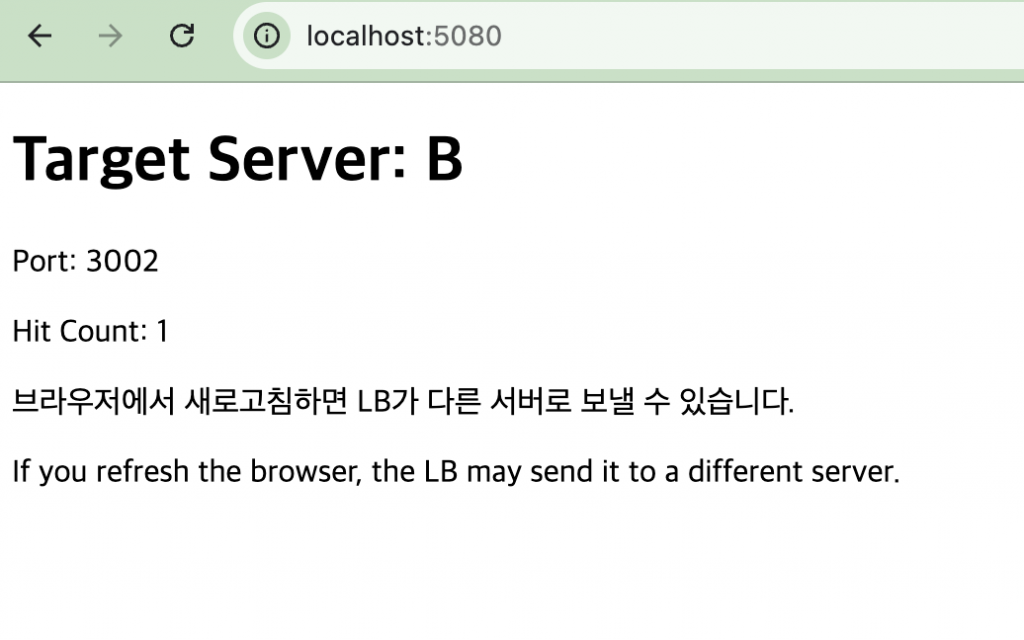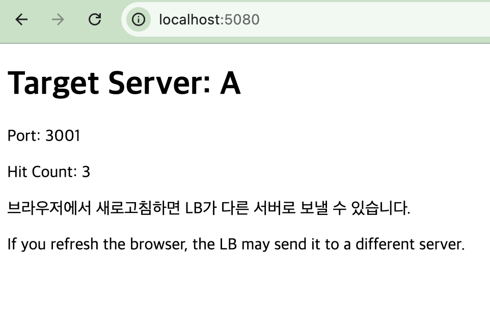 "<p>브라우저에서 새로고침하면 LB가 다른 서버로 보낼 수 있습니다.</p>"